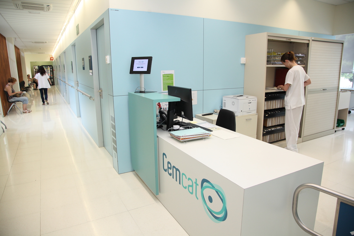 La zona de Recepció amb el personal que atén el pacient en entrar al Cemcat la trobem a la planta 0. Des d’allà s’atenen també les més de 1.300 consultes rebudes anualment per telèfon i per correu electrònic. En aquesta recepció es faciliten enquestes de satisfacció a través de dispositius tàctils, que també estan disponibles a la zona de consultes.