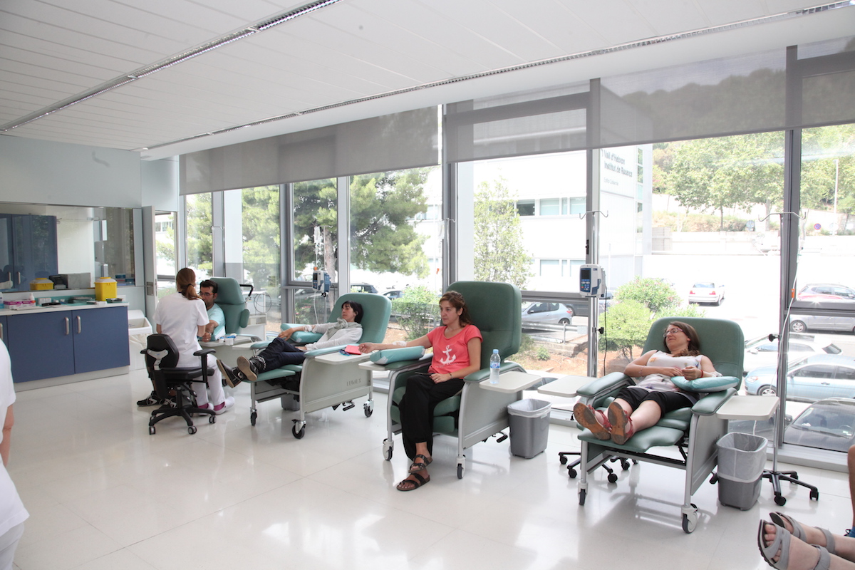 L’Hospital de Dia, també a la planta 1, consta d’una sala per a l’administració de fàrmacs endovenosos amb vuit butaques i d’una sala per a procediments que requereixen de privacitat (punció lumbar, infiltració de toxina botulínica, entre d’altres).